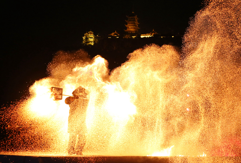 非遺火秀表演現(xiàn)場(chǎng),來(lái)自河南的4位表演者,為南通市民帶來(lái)精彩紛呈的演出。