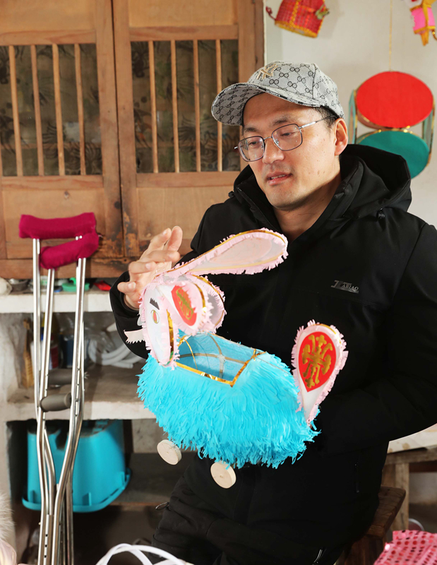 今年春節(jié)是首個(gè)“非遺版春節(jié)”,元宵節(jié)將至,肢體二級(jí)殘疾人陳泉在啟東市寅陽(yáng)鎮(zhèn)和豐村家中埋頭趕制秦淮燈彩兔子燈?!拔以诙兑糁辈ラg為陳泉銷售兔子燈,只剩下10余只了?!?1日,網(wǎng)名為“包一手”的知名殘疾人網(wǎng)紅包漢明告訴記者,已有80余人購(gòu)買了兔子燈。