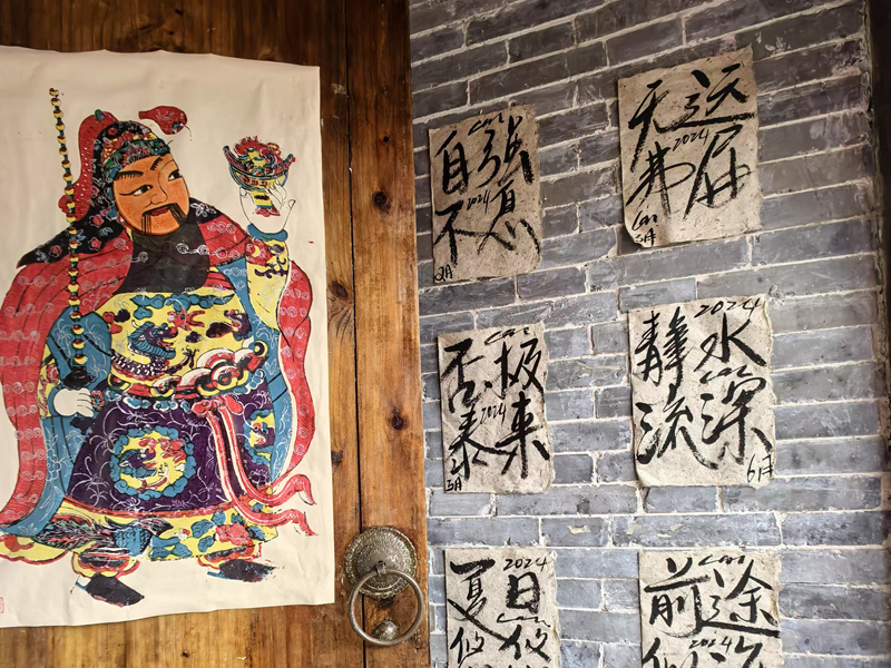 走進咖啡店,一股濃烈的傳統(tǒng)文化氣息撲面而來。屋內(nèi)兩根木柱上張貼著一對木版年畫《狀元將軍》,點餐臺則以畫幅更小的木版年畫《五子將軍》為裝飾,頂燈下懸掛著蛇紋螺旋造型的紅色剪紙投射出柔美的光影,《錦鯉送?!贰断采稀懊贰鄙摇贰哆B連有“?!薄返仍煨透鳟惖募艏埓盎c綴四處,四幅精致秀美的木藝雕刻掛于墻面,咖啡味、年味與文化味在小小的咖啡屋中氤氳開來。