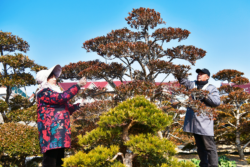 “‘如派盆景’是中國盆景七大流派之一,以‘云頭、雨足、美人腰’的特色著稱,大家直播間下單就可以購買?!辩R頭前,花木老板郝昌桂搖身一變,當(dāng)起了“盆景帶貨主播”,熱情地給直播間的消費(fèi)者講解自家的盆景。