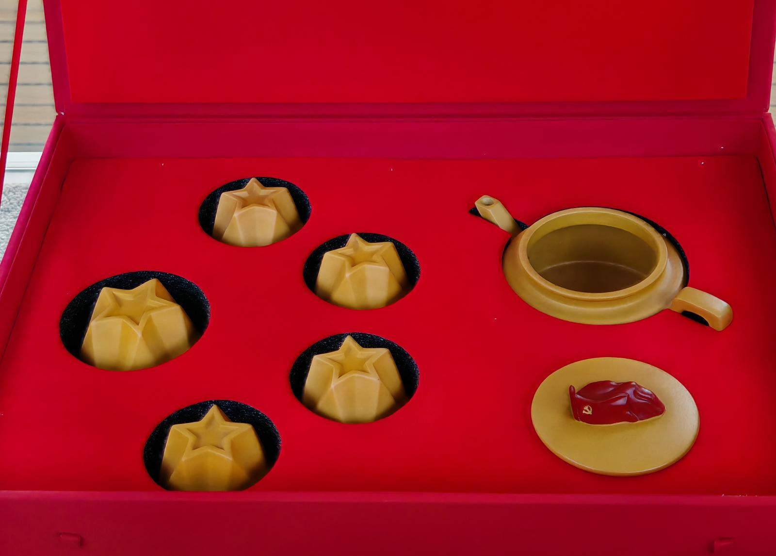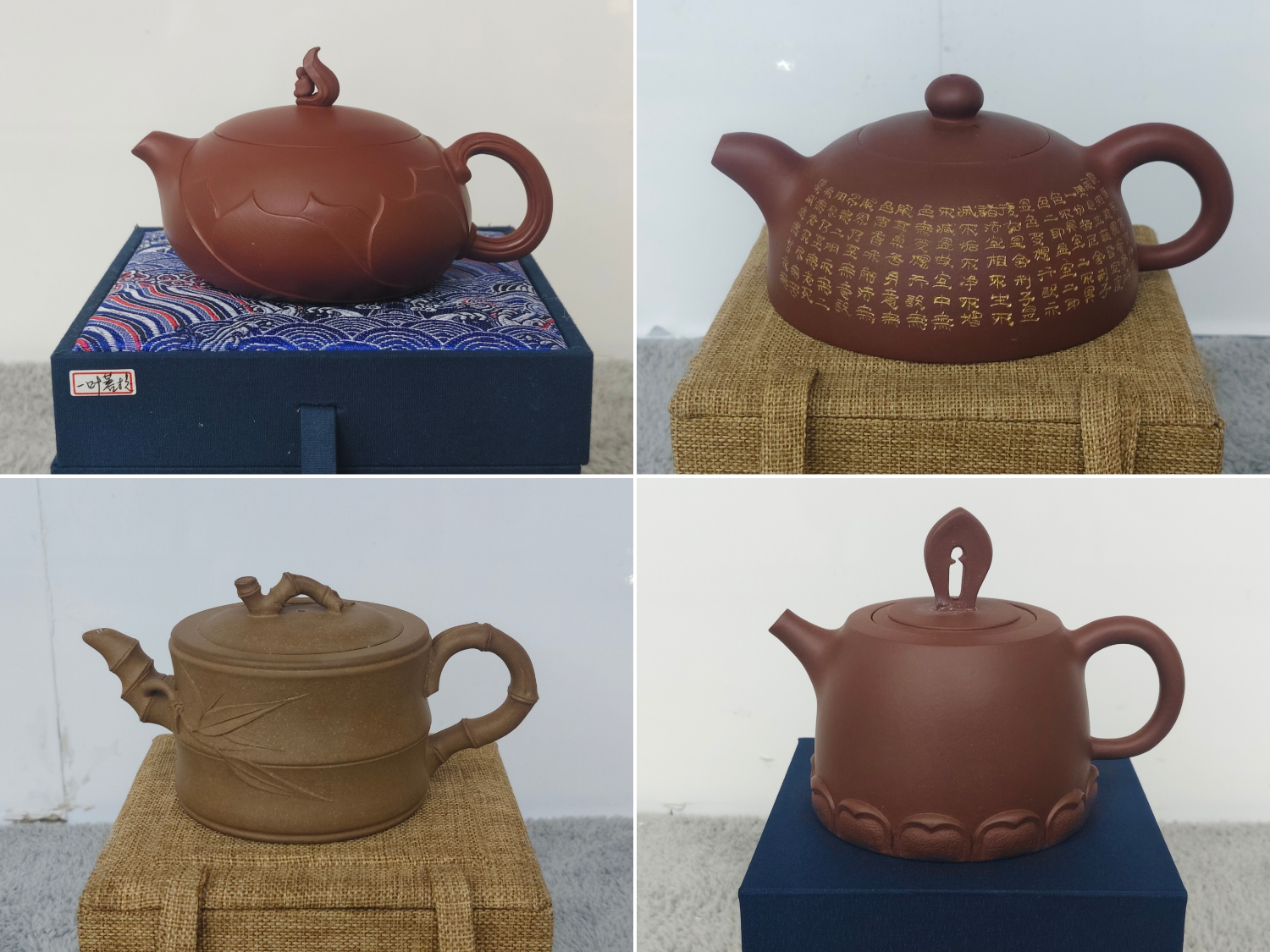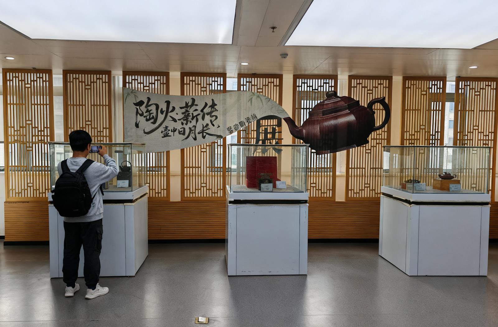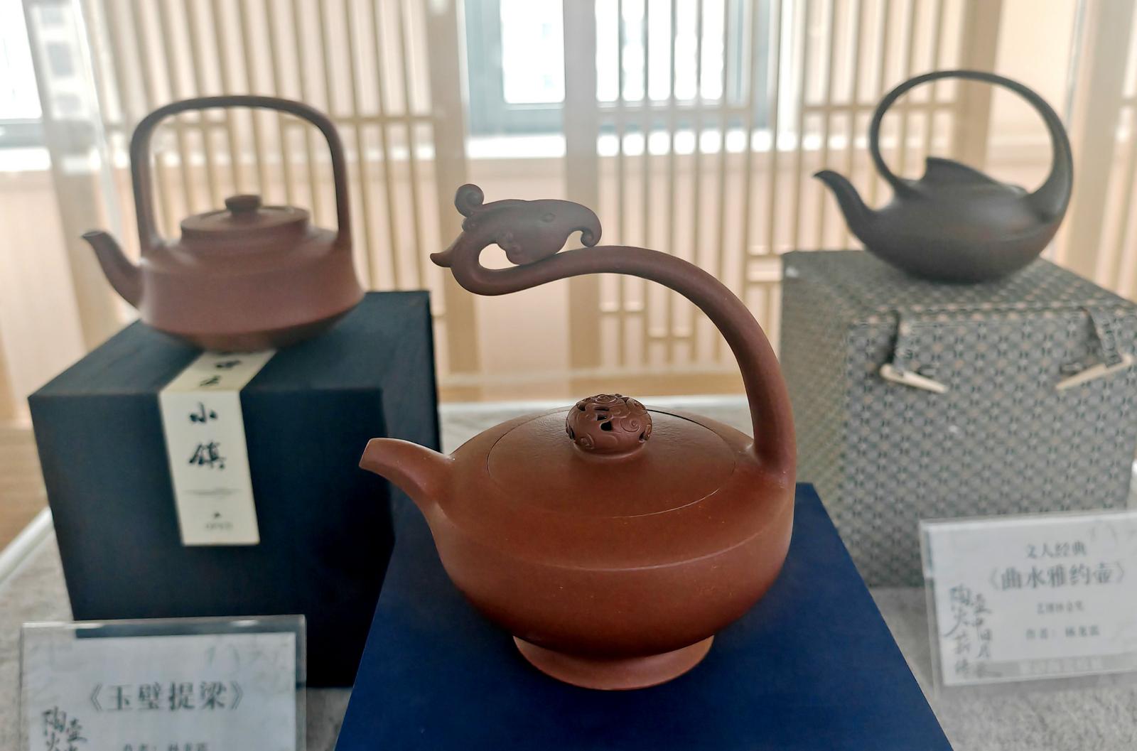 展廳內(nèi),紫砂作品《建黨百年》套組大氣莊重,紅色的禮盒與精致的茶具相得益彰,既具實用價值,又飽含對黨的深情禮贊;《楚漢風云》壺造型獨特,壺蓋上的瑞獸靈動傳神,仿佛將那段波瀾壯闊的歷史濃縮于方寸之間;曾榮獲2021藝博銀獎的《縱有千古橫有八荒》以逼真的螃蟹造型,展現(xiàn)出紫砂藝術惟妙惟肖的表現(xiàn)力。此外,《玉璧提梁》《鳳首壺》《曲水雅約壺》等佳作,或古樸典雅,或靈動精巧。值得一提的是,該展覽還通過文字與圖片,系統(tǒng)梳理了紫砂陶瓷的歷史淵源、材質特點——從紫砂泥料的種類與特性,到制壺工藝的演變發(fā)展,為觀眾搭建起了解紫砂文化的橋梁,讓大家在欣賞藝術佳作之余,更能深入領略紫砂陶瓷所承載的深厚文化底蘊。展覽至本月底結束。