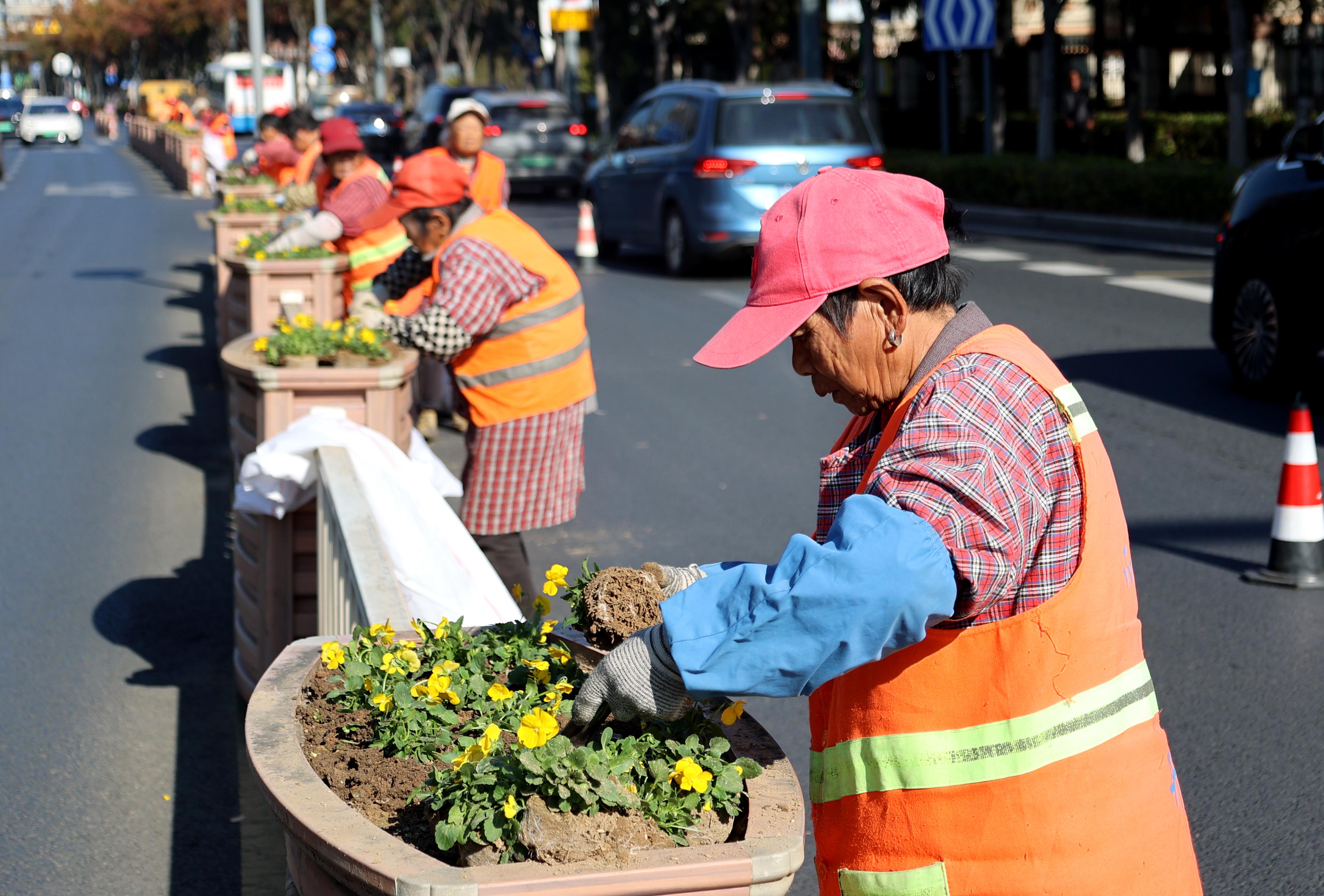 11月5日,南通開發(fā)區(qū)園林建設(shè)有限公司的綠化作業(yè)人員在市區(qū)躍龍路為花卉換季。立冬節(jié)氣臨近,綠化部門在市區(qū)主干道、公園等處更換花卉,將品種菊等秋季花卉換成角堇等冬季花卉。