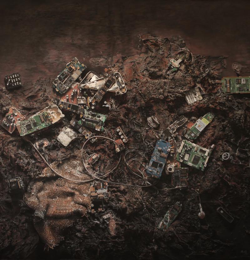 創(chuàng)作于2018年的作品《疊·G時(shí)代》,至今仍具現(xiàn)實(shí)意義。彼時(shí),綜合材料繪畫(huà)在國(guó)內(nèi)興起,其獨(dú)特的現(xiàn)代表現(xiàn)形式讓馮衛(wèi)軍對(duì)其產(chǎn)生了興趣。偶然讀到一篇關(guān)于“歐洲很多電子垃圾流向亞非,造成當(dāng)?shù)亟】祮?wèn)題”的報(bào)道,令他深受觸動(dòng),也啟發(fā)他嘗試以藝術(shù)方式喚起人們對(duì)生態(tài)環(huán)境的關(guān)注。在他的構(gòu)思下,濕潤(rùn)的土壤、破碎的麻布,沾著泥土的電線、手機(jī)主板、螺絲等材料,經(jīng)過(guò)反復(fù)剪切、鋪陳和拼貼,最終構(gòu)成了這件綜合材料作品。